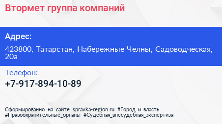 Втормет, группа компаний по адресу 423800, Татарстан, Набережные Челны, Садоводческая, 20а в дальнейшем Организация, размещена в следующих категориях: