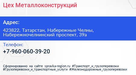 Цех Металлоконструкций по адресу 423822, Татарстан, Набережные Челны, Набережночелнинский проспект, 39а в дальнейшем Организация, размещена в следующих категориях:
