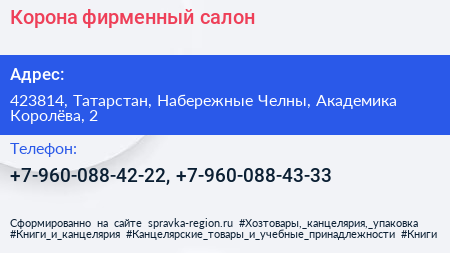 Корона, фирменный салон по адресу 423814, Татарстан, Набережные Челны, Академика Королёва, 2 в дальнейшем Организация, размещена в следующих категориях: