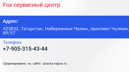 Fox, сервисный центр по адресу 423832, Татарстан, Набережные Челны, проспект Чулман, 89/57 в дальнейшем Организация, размещена в следующих категориях: