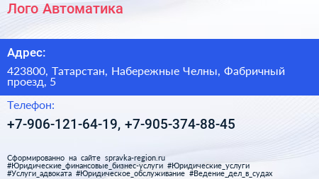 Лого Автоматика по адресу 423800, Татарстан, Набережные Челны, Фабричный проезд, 5 в дальнейшем Организация, размещена в следующих категориях: