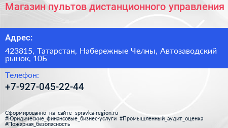 Магазин пультов дистанционного управления по адресу 423815, Татарстан, Набережные Челны, Автозаводский рынок, 10Б в дальнейшем Организация, размещена в следующих категориях:
