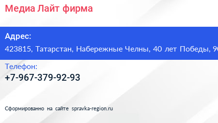 Медиа Лайт, фирма по адресу 423815, Татарстан, Набережные Челны, 40 лет Победы, 90 в дальнейшем Организация, размещена в следующих категориях: