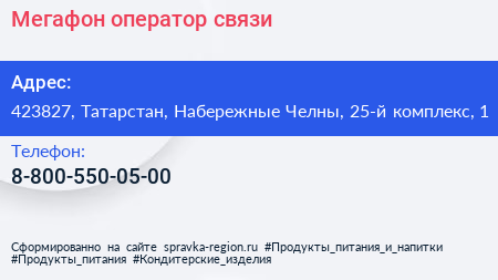Мегафон, оператор связи по адресу 423827, Татарстан, Набережные Челны, 25-й комплекс, 1 в дальнейшем Организация, размещена в следующих категориях: