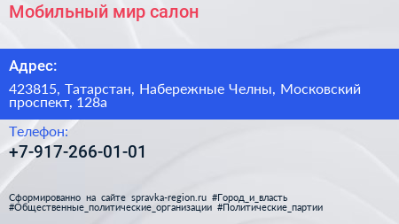 Мобильный мир, салон по адресу 423815, Татарстан, Набережные Челны, Московский проспект, 128а в дальнейшем Организация, размещена в следующих категориях: