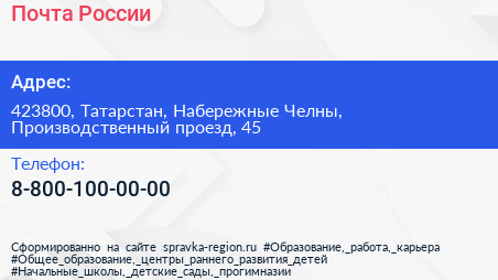 Почта России по адресу 423800, Татарстан, Набережные Челны, Производственный проезд, 45 в дальнейшем Организация, размещена в следующих категориях: