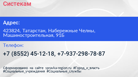 Систекам по адресу 423824, Татарстан, Набережные Челны, Машиностроительная, 91Б в дальнейшем Организация, размещена в следующих категориях: