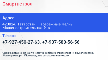 Смартпетрол по адресу 423824, Татарстан, Набережные Челны, Машиностроительная, 91а в дальнейшем Организация, размещена в следующих категориях: