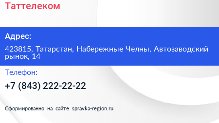 Таттелеком по адресу 423815, Татарстан, Набережные Челны, Автозаводский рынок, 14 в дальнейшем Организация, размещена в следующих категориях: