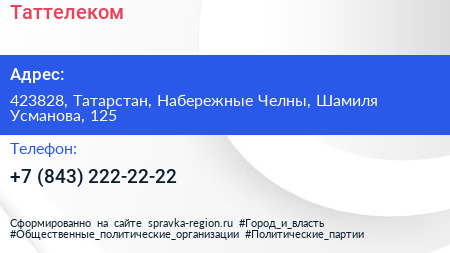 Таттелеком по адресу 423828, Татарстан, Набережные Челны, Шамиля Усманова, 125 в дальнейшем Организация, размещена в следующих категориях: