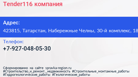 Tender116, компания по адресу 423815, Татарстан, Набережные Челны, 30-й комплекс, 18 в дальнейшем Организация, размещена в следующих категориях: