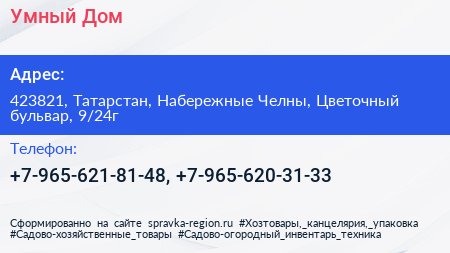 Умный Дом по адресу 423821, Татарстан, Набережные Челны, Цветочный бульвар, 9/24г в дальнейшем Организация, размещена в следующих категориях: