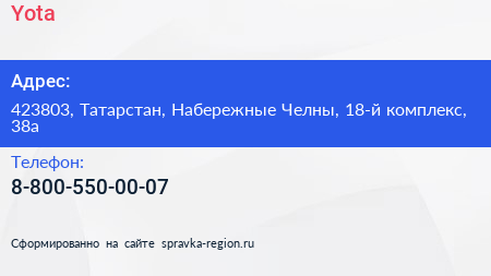 Yota по адресу 423803, Татарстан, Набережные Челны, 18-й комплекс, 38а в дальнейшем Организация, размещена в следующих категориях:
