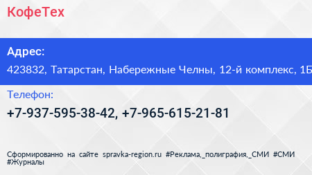 КофеТех по адресу 423832, Татарстан, Набережные Челны, 12-й комплекс, 1Б в дальнейшем Организация, размещена в следующих категориях: