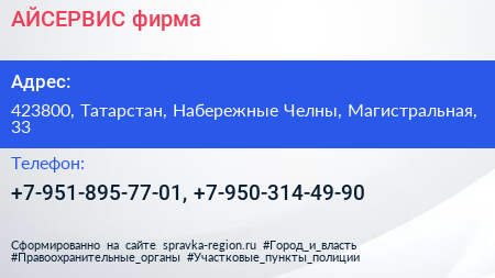 АЙСЕРВИС, фирма по адресу 423800, Татарстан, Набережные Челны, Магистральная, 33 в дальнейшем Организация, размещена в следующих категориях: