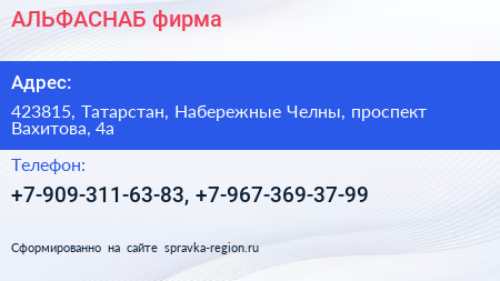 АЛЬФАСНАБ, фирма по адресу 423815, Татарстан, Набережные Челны, проспект Вахитова, 4а в дальнейшем Организация, размещена в следующих категориях: