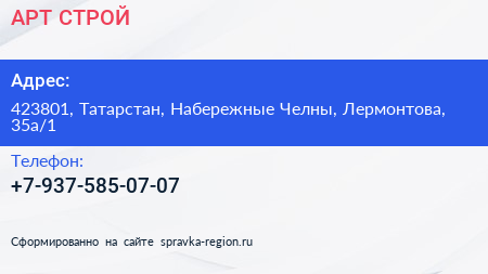 АРТ СТРОЙ по адресу 423801, Татарстан, Набережные Челны, Лермонтова, 35а/1 в дальнейшем Организация, размещена в следующих категориях:
