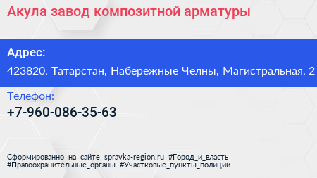 Акула, завод композитной арматуры по адресу 423820, Татарстан, Набережные Челны, Магистральная, 2 в дальнейшем Организация, размещена в следующих категориях: