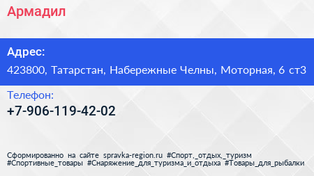 Армадил по адресу 423800, Татарстан, Набережные Челны, Моторная, 6 ст3 в дальнейшем Организация, размещена в следующих категориях: