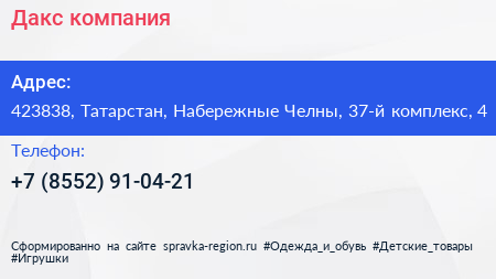 Дакс, компания по адресу 423838, Татарстан, Набережные Челны, 37-й комплекс, 4 в дальнейшем Организация, размещена в следующих категориях: