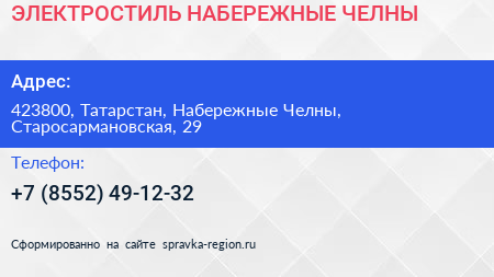 ЭЛЕКТРОСТИЛЬ НАБЕРЕЖНЫЕ ЧЕЛНЫ по адресу 423800, Татарстан, Набережные Челны, Старосармановская, 29 в дальнейшем Организация, размещена в следующих категориях: