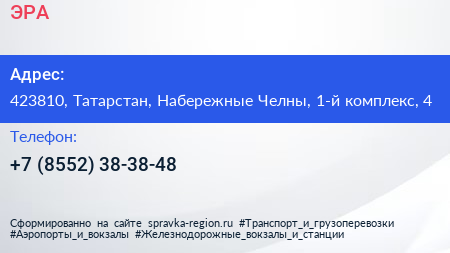 ЭРА по адресу 423810, Татарстан, Набережные Челны, 1-й комплекс, 4 в дальнейшем Организация, размещена в следующих категориях: