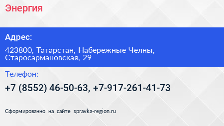 Энергия по адресу 423800, Татарстан, Набережные Челны, Старосармановская, 29 в дальнейшем Организация, размещена в следующих категориях: