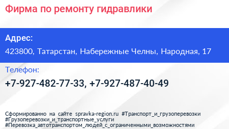 Фирма по ремонту гидравлики по адресу 423800, Татарстан, Набережные Челны, Народная, 17 в дальнейшем Организация, размещена в следующих категориях: