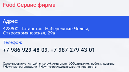 Food Сервис, фирма по адресу 423800, Татарстан, Набережные Челны, Старосармановская, 29а в дальнейшем Организация, размещена в следующих категориях: