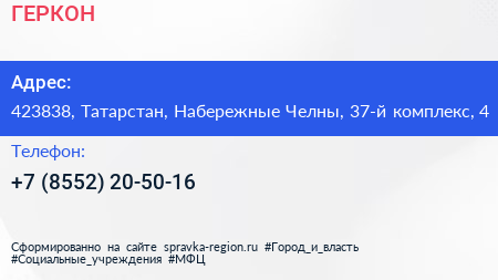 ГЕРКОН по адресу 423838, Татарстан, Набережные Челны, 37-й комплекс, 4 в дальнейшем Организация, размещена в следующих категориях: