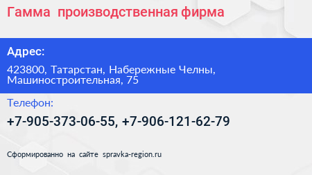 Гамма+, производственная фирма по адресу 423800, Татарстан, Набережные Челны, Машиностроительная, 75 в дальнейшем Организация, размещена в следующих категориях: