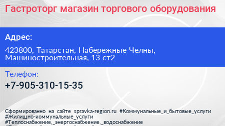 Гастроторг, магазин торгового оборудования по адресу 423800, Татарстан, Набережные Челны, Машиностроительная, 13 ст2 в дальнейшем Организация, размещена в следующих категориях: