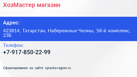 ХозМастер, магазин по адресу 423814, Татарстан, Набережные Челны, 58-й комплекс, 23Б в дальнейшем Организация, размещена в следующих категориях: