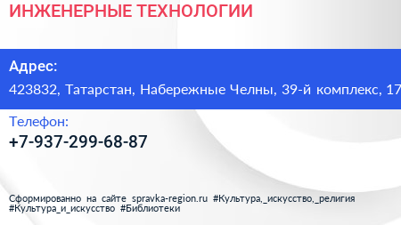 ИНЖЕНЕРНЫЕ ТЕХНОЛОГИИ по адресу 423832, Татарстан, Набережные Челны, 39-й комплекс, 17 в дальнейшем Организация, размещена в следующих категориях: