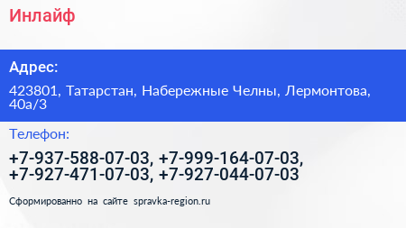 Инлайф по адресу 423801, Татарстан, Набережные Челны, Лермонтова, 40а/3 в дальнейшем Организация, размещена в следующих категориях: