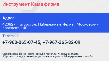 Инструмент Кама, фирма по адресу 423827, Татарстан, Набережные Челны, Московский проспект, 140 в дальнейшем Организация, размещена в следующих категориях:
