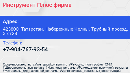 Инструмент Плюс, фирма по адресу 423800, Татарстан, Набережные Челны, Трубный проезд, 3 ст28 в дальнейшем Организация, размещена в следующих категориях: