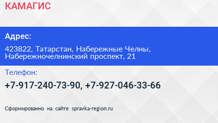КАМАГИС по адресу 423822, Татарстан, Набережные Челны, Набережночелнинский проспект, 21 в дальнейшем Организация, размещена в следующих категориях: