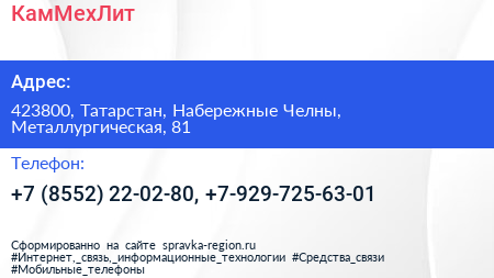 КамМехЛит по адресу 423800, Татарстан, Набережные Челны, Металлургическая, 81 в дальнейшем Организация, размещена в следующих категориях: