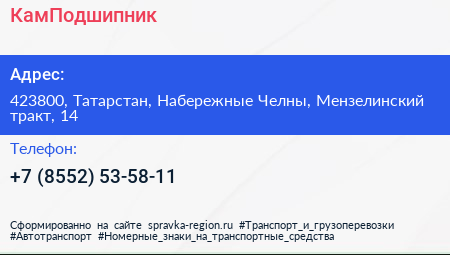 КамПодшипник по адресу 423800, Татарстан, Набережные Челны, Мензелинский тракт, 14 в дальнейшем Организация, размещена в следующих категориях: