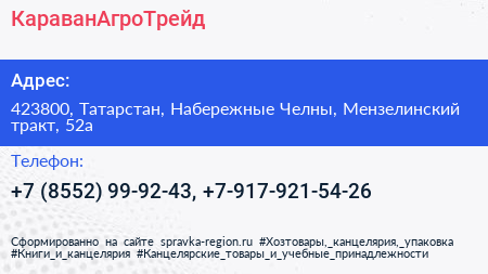 КараванАгроТрейд по адресу 423800, Татарстан, Набережные Челны, Мензелинский тракт, 52а в дальнейшем Организация, размещена в следующих категориях: