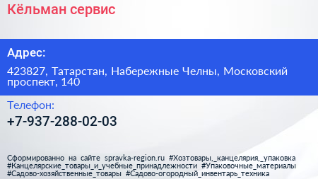 Кёльман сервис по адресу 423827, Татарстан, Набережные Челны, Московский проспект, 140 в дальнейшем Организация, размещена в следующих категориях: