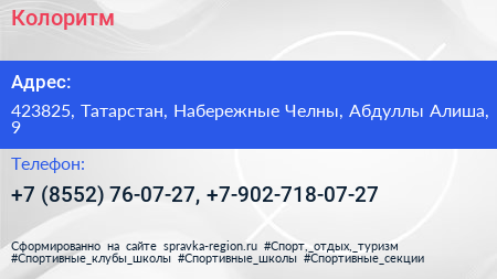 Колоритм по адресу 423825, Татарстан, Набережные Челны, Абдуллы Алиша, 9 в дальнейшем Организация, размещена в следующих категориях: