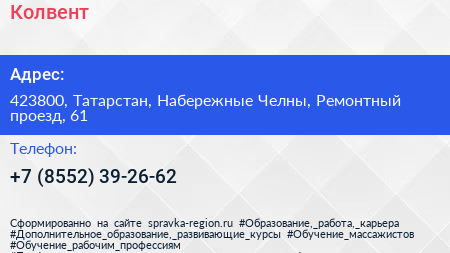 Колвент по адресу 423800, Татарстан, Набережные Челны, Ремонтный проезд, 61 в дальнейшем Организация, размещена в следующих категориях: