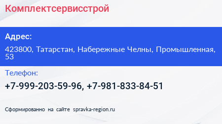Комплектсервисстрой по адресу 423800, Татарстан, Набережные Челны, Промышленная, 53 в дальнейшем Организация, размещена в следующих категориях: