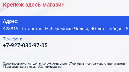 Крепеж здесь, магазин по адресу 423815, Татарстан, Набережные Челны, 40 лет Победы, 84 в дальнейшем Организация, размещена в следующих категориях: