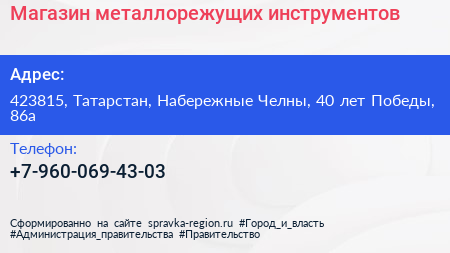Магазин металлорежущих инструментов по адресу 423815, Татарстан, Набережные Челны, 40 лет Победы, 86а в дальнейшем Организация, размещена в следующих категориях:
