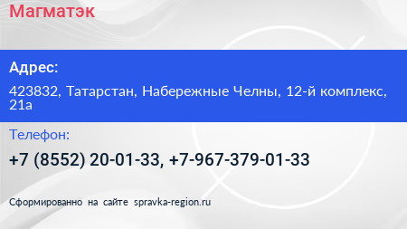 Магматэк по адресу 423832, Татарстан, Набережные Челны, 12-й комплекс, 21а в дальнейшем Организация, размещена в следующих категориях: