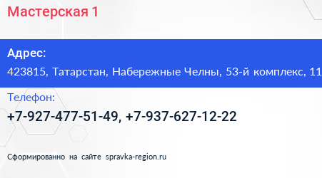 Мастерская №1 по адресу 423815, Татарстан, Набережные Челны, 53-й комплекс, 11 в дальнейшем Организация, размещена в следующих категориях: