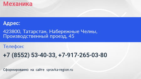 Механика по адресу 423800, Татарстан, Набережные Челны, Производственный проезд, 45 в дальнейшем Организация, размещена в следующих категориях: